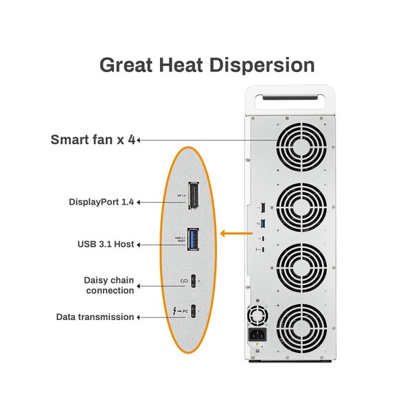 يتوافق TerraMaster's 16-bay D16 Thunderbolt 3 مع أقراص SATA مقاس 3.5 بوصة ومحركات أقراص SSD مقاس 2.5 بوصة، مما يسمح للمحترفين بالاستفادة من سعة تخزين إجمالية تصل إلى 288 تيرابايت. ونتيجة لذلك، يمكنك التأكد من أن الجهاز يوفر لك الأدوات التي تحتاجها للتغلب على أي تحدي تخزين.