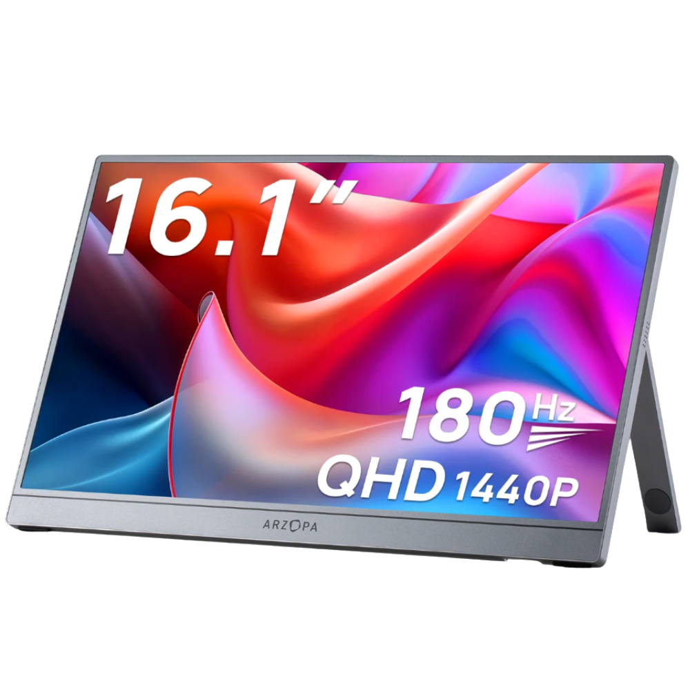 - Arzopa 16.1″ Z3FC شاشة ألعاب محمولة بدقة 2K، معدل تحديث 180Hz، لوحة IPS، مع سماعات ومنافذ Mini HDMI وUSB-C