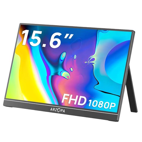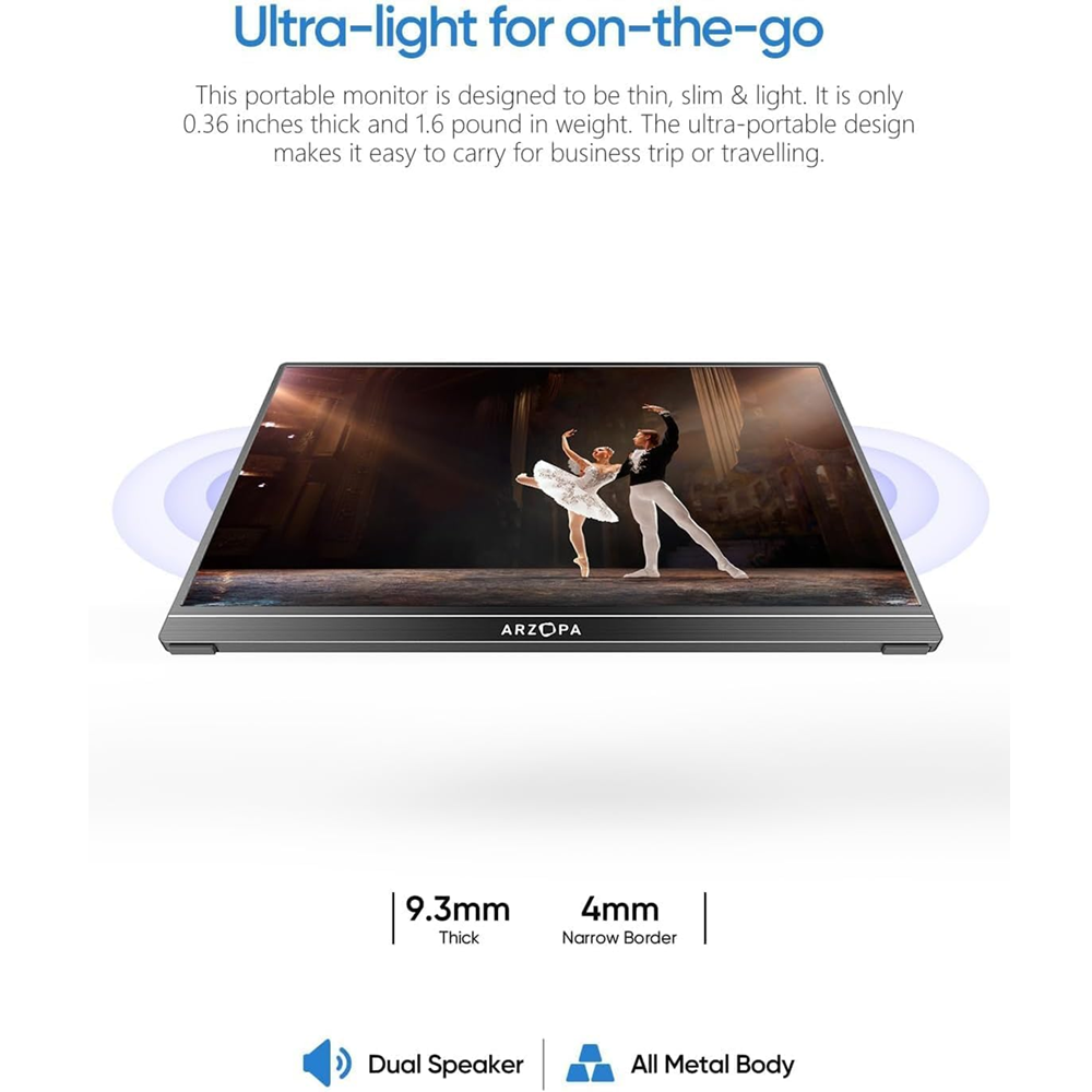 Arzopa شاشة 15.6 بوصة نحيفة، خفيفة وسهلة الحمل دقة FHD (1920 × 1080)، نوع اللوحة: IPS سُمك 0.36 بوصة ووزن 1.60 رطل