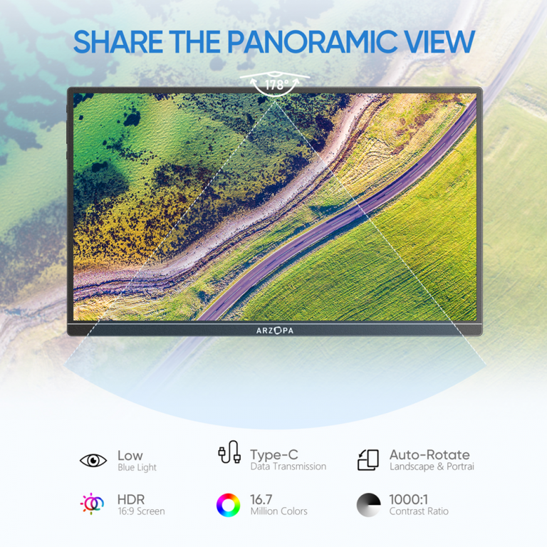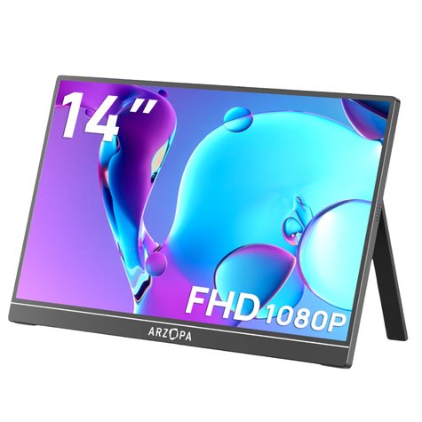 - شاشة محمولة Arzopa A1S مقاس 14 بوصة فائقة النحافة بدقة FHD ولوحة IPS مع سماعات، USB-C وMini HDMI
