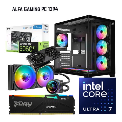 Alfa Gaming PC 1394 معالج Intel Core Ultra 9 (السلسلة 2) 265K اللوحة الأم MSI PRO Z890-S WiFi ATX ذاكرة Kingston 32GB DDR5 بتردد 6000MHz Fury Beast RGB بطاقة رسومات PNY GeForce RTX 5060 Ti بسعة 16GB مكسورة السرعة مع مروحتين