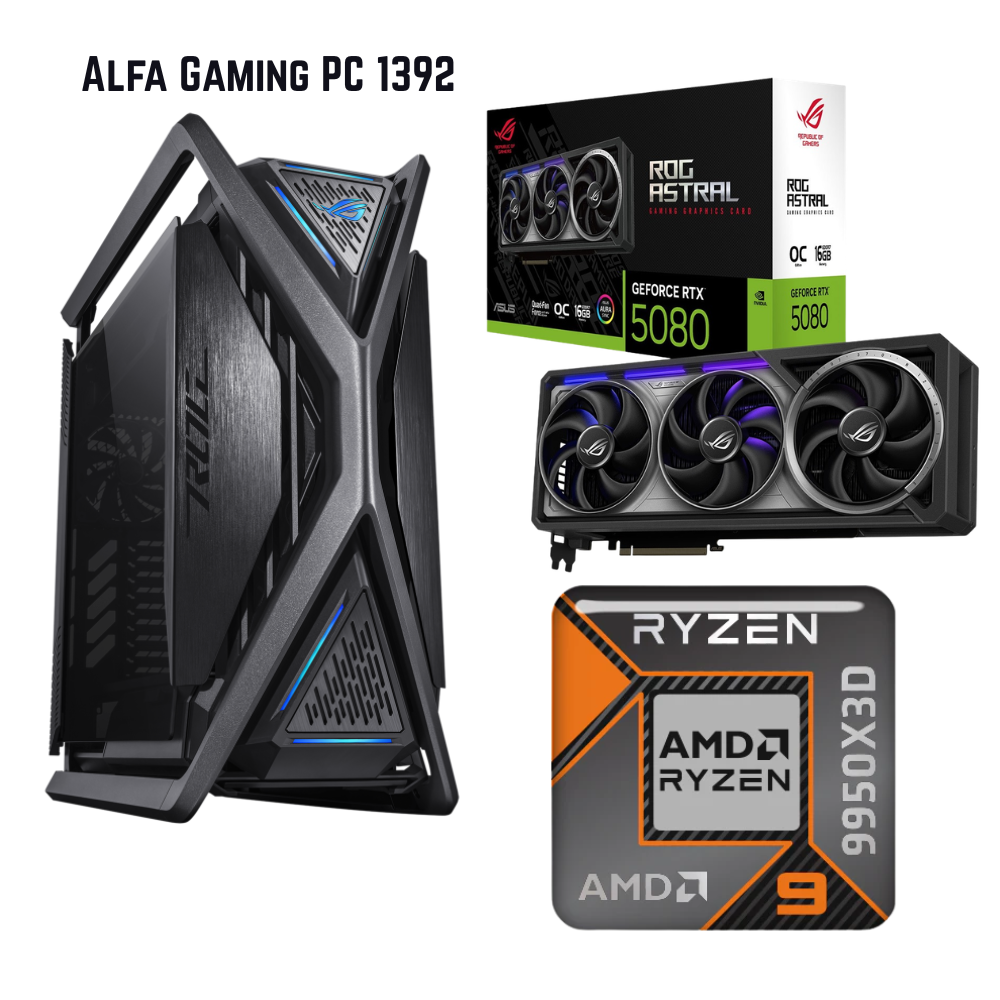 - كمبيوتر ألعاب Alfa Gaming PC 1392 بمعالج AMD Ryzen 9950X3D وبطاقة RTX 5080 16GB وذاكرة 64GB RAM وقرص 2TB NVMe مع صندوق ASUS GR701 ونظام Windows 11 Pro