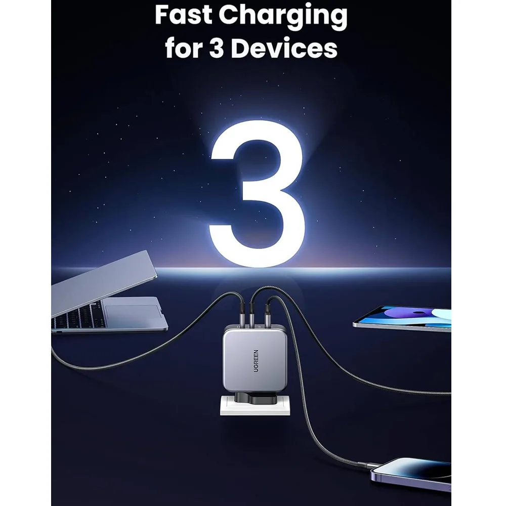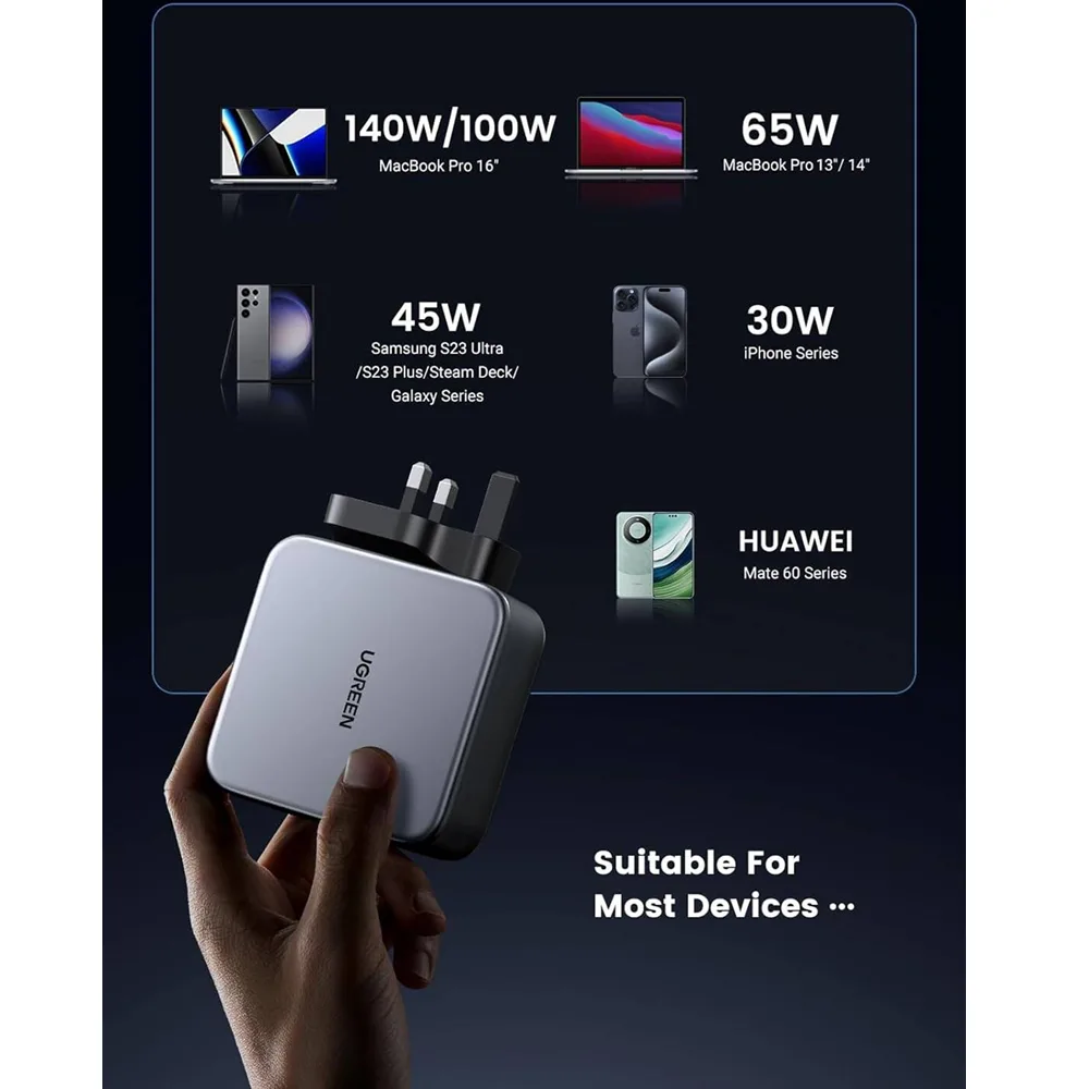 يوجرين (UGREEN) شاحن جداري بقوة 140 واط وتقنية GaN شاحن فائق السرعة لجهاز ماك بوك برو (MacBook Pro) شاحن 3 في 1 متعدد المنافذ لأجهزة الكمبيوتر المحمول (اللابتوب)