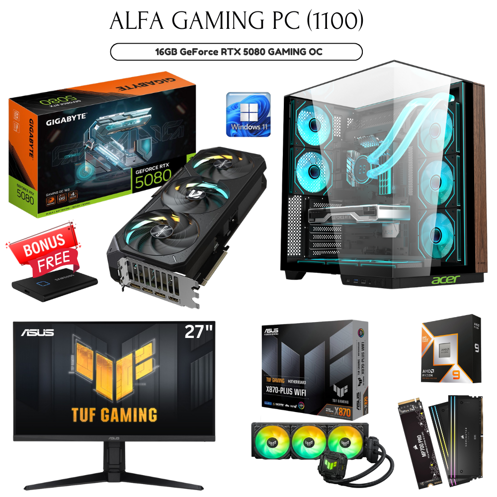 - Alfa Gaming PC 1100 AMD 9900X3D, 16GB RTX5080, 64GB RAM, 2TB SSD, ASUS 27″ 260Hz, Acer V333BK, W11Pro, Free Bonus