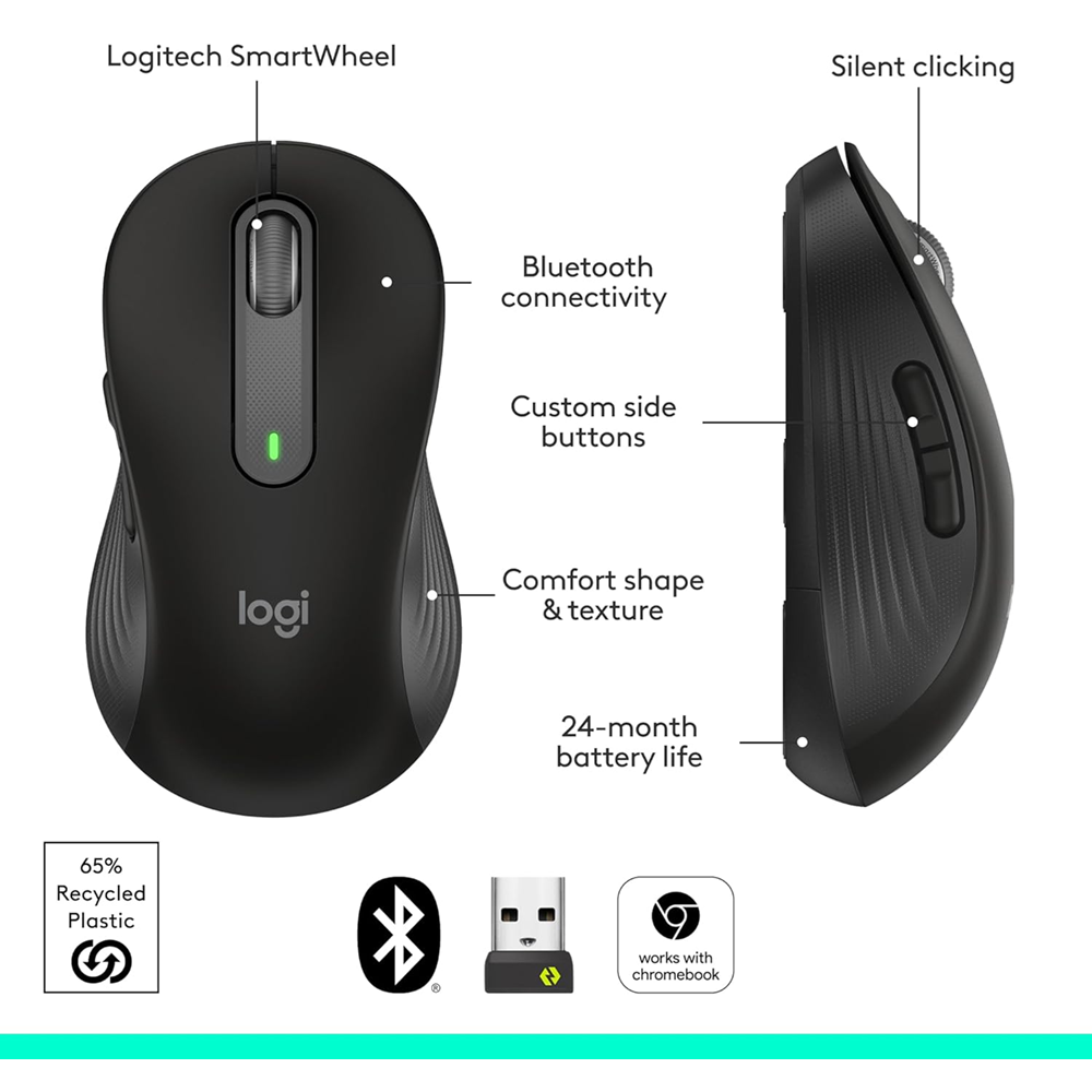 Logitech M650 L more productivity SmartWheel scrolling SilentTouch technology Customizable side buttons For lage sized left hands Connect via Bluetooth or Logi Bolt USB receive