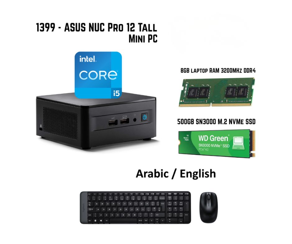 - ASUS Bundle 1399 NUC 12 Pro Tall Mini PC, i5-1240P, 8GB, 500GB, W11Pro, Logitech MK220 Wireless Combo
